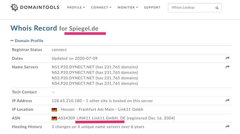 So sieht die Domainsuche bei seriösen Anbietern aus, die ansprechbar sind. Die Seiten von spiegel.de hostet die Link11 GmbH mit Sitz in Frankfurt.
